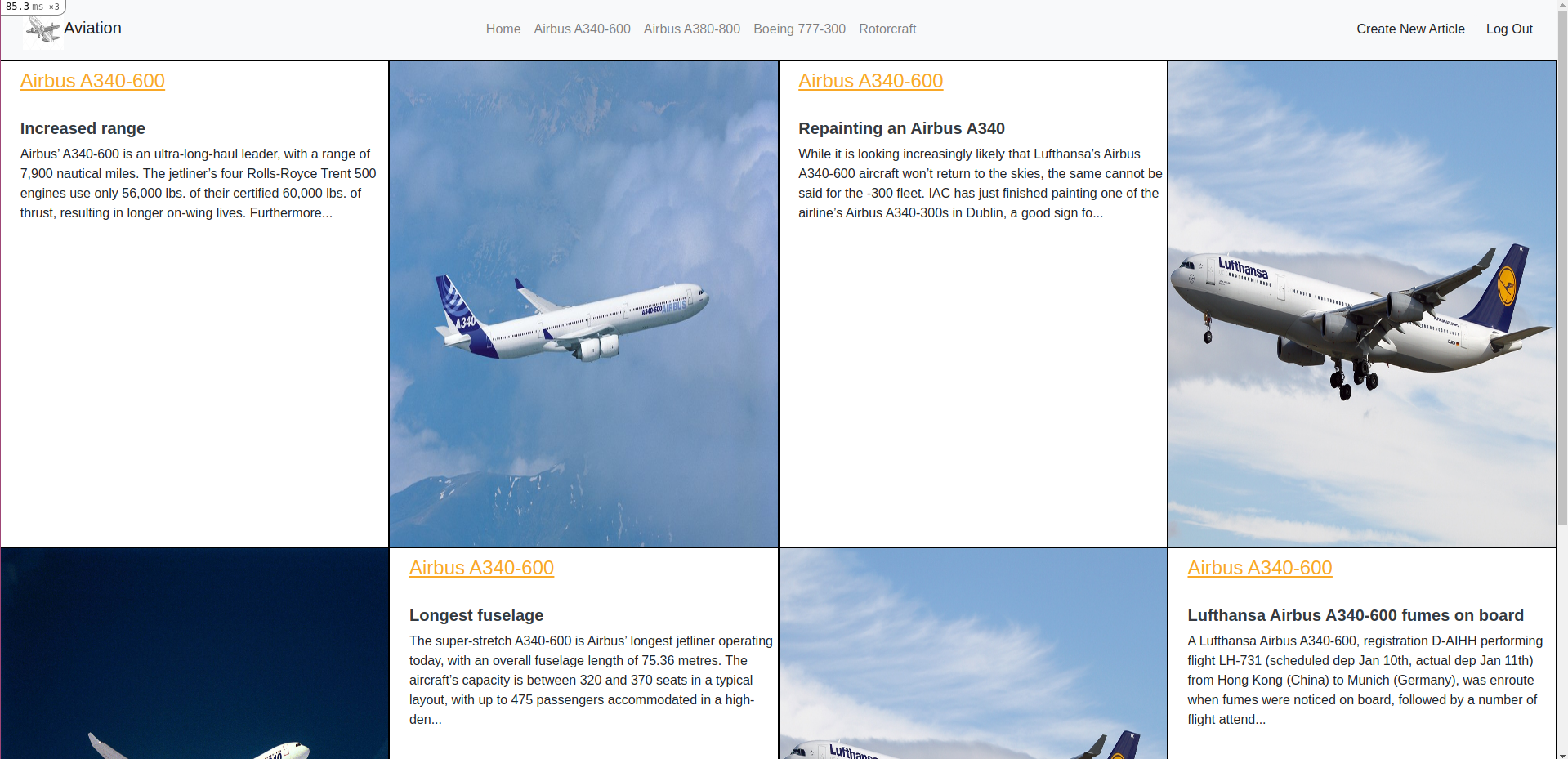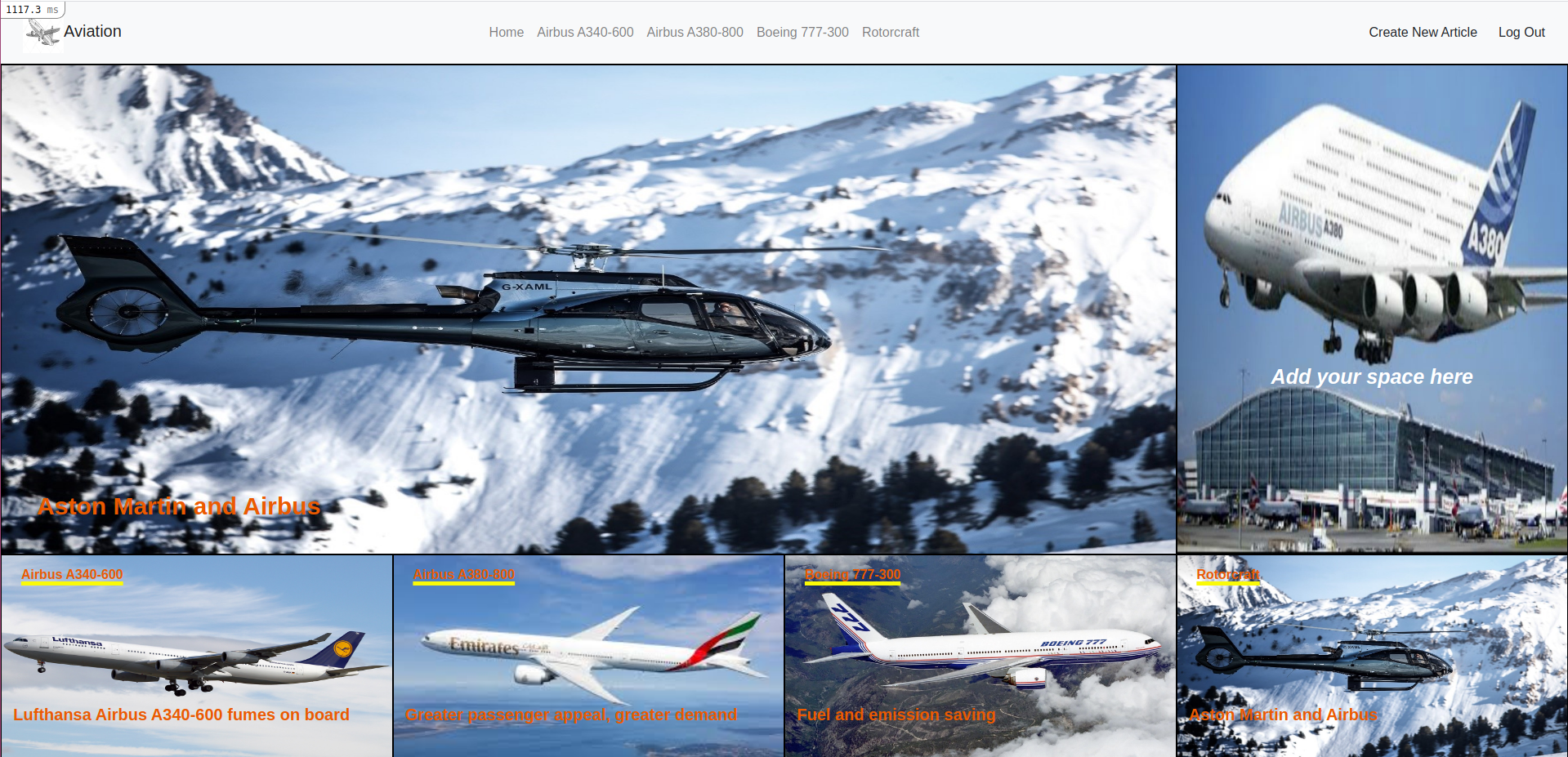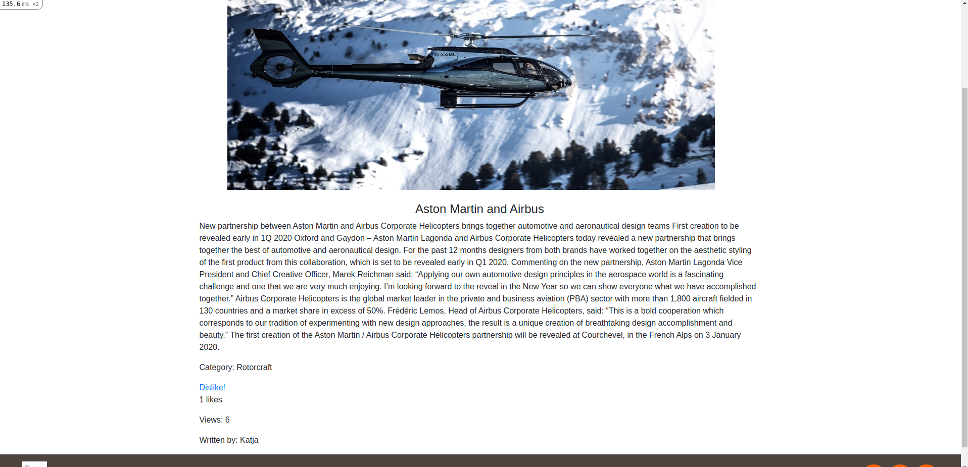 Aircraft Magazine lets you published articles. You can choose category in which article belongs to. On the show page you can see image, text and title of article, category, author of the text and likes....