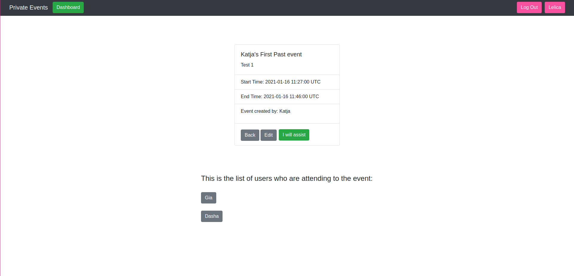 In this project you can schedule event. On the dashboard you can see past and future events of all users. You can also attend to event. On the user's profile you can see just user's events. Events are separated to the future and past events....